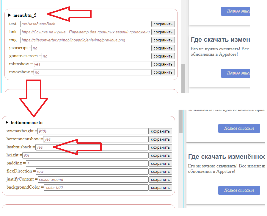 Жмите "СОХРАНИТЬ" после изменения параметровЯ понимаю, но так сложилось исторически. Просто прописывайте открытие нужной ссылки в поле JAVASCRIPT в формате, который там указан и жмите сохранить. Не думайте об остальных параметрах. Разработка мобильного приложения идёт уже не первый год, поэтому некоторые вещи оставлегны для поддержки старых версий.